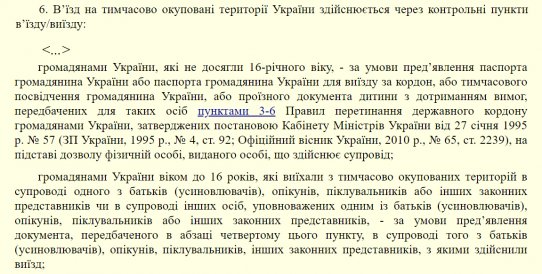 Что касается детей до 16 лет, то согласно новому Порядку, с 29 октября по свидетельству о рождении уже не будут пропускать – только в направлении неподконтрольной территории. Но в Порядке об этом четко не сказано.