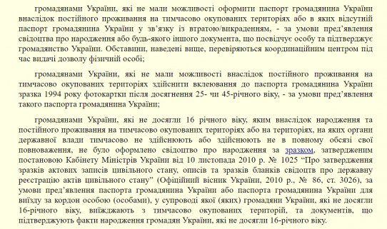 Итак, в новом Порядке относительно въезда на неподконтрольную территорию, в частности, говорится, что через КПВВ могут въехать «граждане Украины, которые не достигли 16-летнего возраста, – при условии предъявления паспорта гражданина Украины или паспорта гражданина Украины для выезда за границу, или временного удостоверения гражданина Украины…».