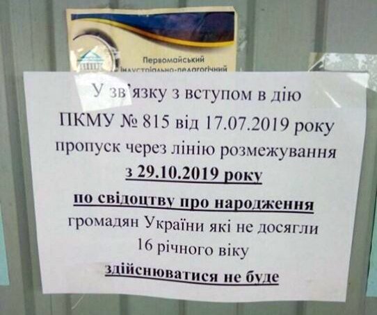 На украинских контрольных пунктах въезда-выезда (КПВВ) уже вывесили объявления, которые и вызвали ажиотаж. В них указано, что с 29 октября пропуск через линию разграничения «по свидетельству о рождении граждан Украины, которые не достигли 16-летнего возраста, осуществляться не будет». Но главная неточность данного объявления (кроме грамматических ошибок) – судя по нему, детей по свидетельству о рождении не будут пропускать в оба направления. А это не так.
