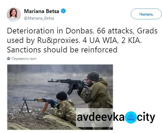 Комментируя обострение на Донбассе, спикер МИД Украины Марьяна Беца призвала мировое сообщество усилить санкции против России, которая продолжается с помощью своих марионеток из "ДНР" и "ЛНР" сеять смерть на Донбассе.