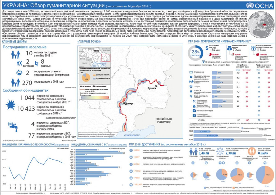 На сегодня, как говорится в отчете ООН, в помощи нуждается 3,4 млн жителей Донбасса. Им необходимы продовольственная безопасность и соцобеспечение. Среди этого числа 2,3 млн жителей Донбасса нуждаются в квалифицированной медицинской помощи и питании.