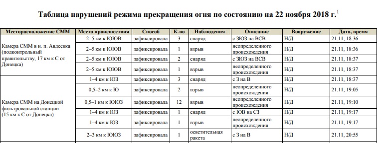 Согласно таблице, которая отображает обстрелы за отчетный период (с вечера 21 ноября по вечер 22 ноября), камера СММ в Авдеевке зафиксировала вечером 21 ноября 2 взрыва неопределенного происхождения, а также пролет 5 снарядов.