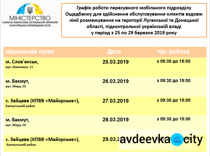 Мобильное подразделение "Ощадбанка" будет обслуживать клиентов вблизи линии разграничения в Славянске, Бахмуте и Зайцево в период с 25 по 29 марта.