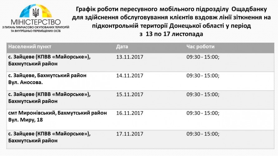 Как передает avdeevka.city со ссылкой на Фейсбук МинВОТ, в период с 13 по 17 ноября мобильное подразделение Ощадбанка будут обслуживать клиентов вблизи линии соприкосновения в Донецкой и Луганской областях. График выглядит следующим образом: