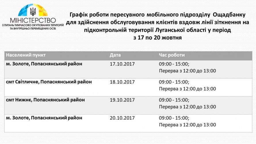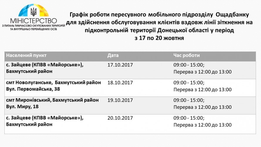 Как сообщает avdeevka.city со ссылкой на страницу МинВОТ в Фейсбуке, в период с 17 по 20 октября мобильное подразделение «Ощадбанка» будет принимать клиентов вблизи линии соприкосновения в Донецкой и Луганской области по следующему графику: