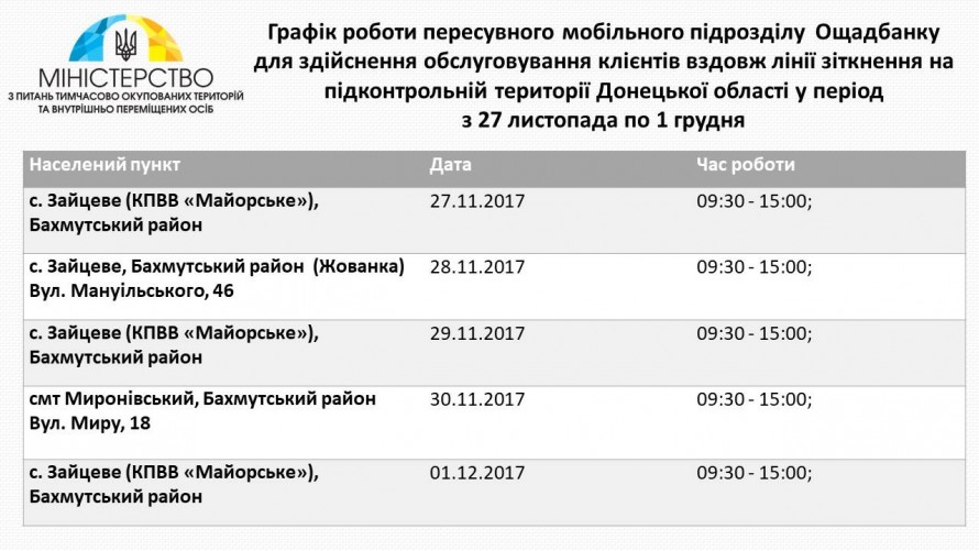 Министерство по вопросам временно оккупированных территорий и внутренне перемещенных лиц Украины опубликовало соответствующий график (в период с 27 ноября по 1 декабря).