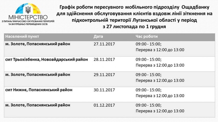 Напомним, что с ноября 2015 года в Донецкой и Луганской областях работают мобильные банковские подразделения Ощадбанка для предоставления банковского обслуживания жителям населенных пунктов прифронтовой зоны.
