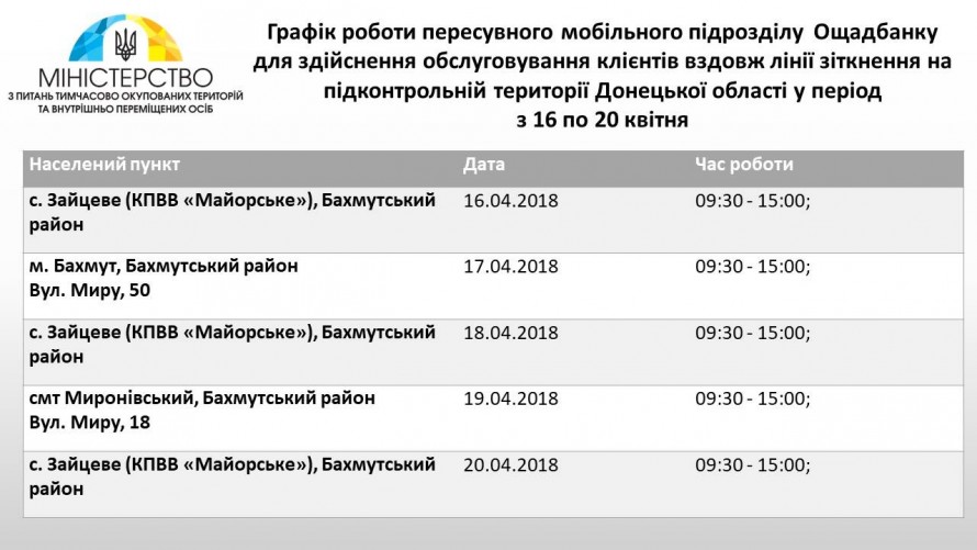 Сегодня, 13 апреля, Министерством по вопросам временно оккупированных территорий и внутренне перемещенных лиц (ВПЛ) Украины опубликован новый график работы мобильных подразделений Ощадбанка в прифронтовой зоне Донетчины.