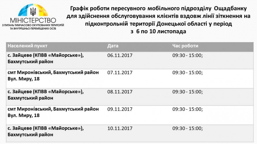 Как сообщает avdeevka.city со ссылкой на МинВОТ, в период с 6 по 10 ноября мобильные подразделения Ощадбанка будут принимать граждан вблизи линии соприкосновения в Донецкой и Луганской области по такому графику:
