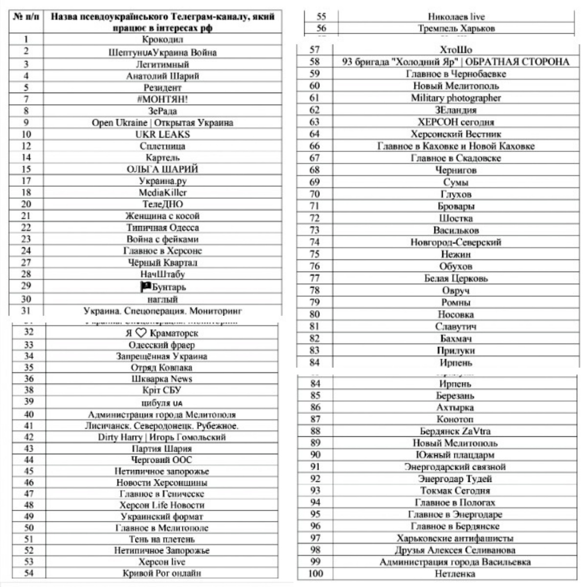 Причетність таких каналів до російських спецслужб рф раніше встановила і Служба безпеки України в рамках відповідних кримінальних проваджень. Так, йдеться про ТГ-канали - Легетимный, Сплетница, Картель, Резидент, Наблюдатель, MediaPost, Женщина с косой та інші телеграм-канали, список яких додається та постійно оновлюється.