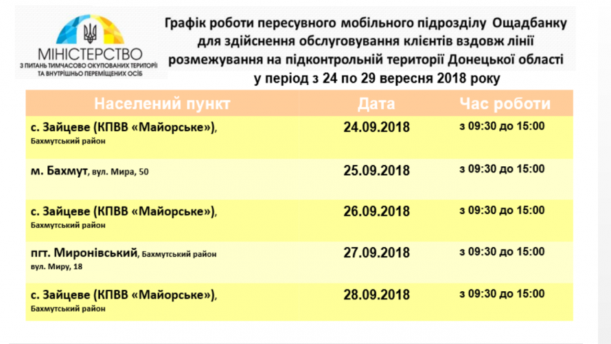По данным Министерства по вопросам временно оккупированных территорий и внутренне перемещенных лиц, МП «Ощадбанка» будет работать в Бахмуте и Бахмутском районе. С графиком работы вы можете ознакомиться ниже.