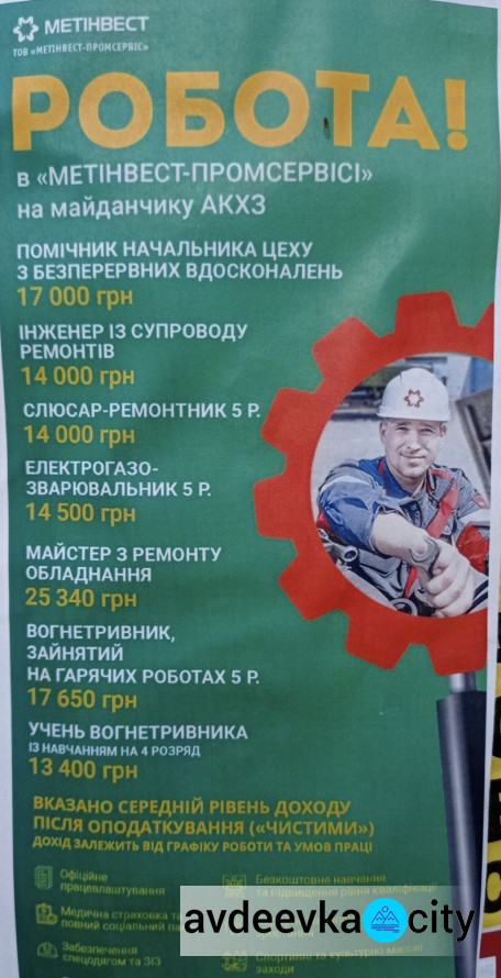 В "МЕТИНВЕСТ-ПРОМСЕРВИС" на площадке АКХЗ открыты вакансии, сообщает avdeevka.city.