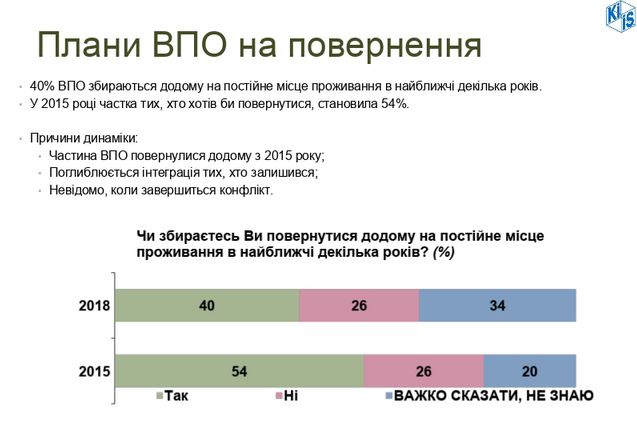«К возвращению могут побудить нерешенные проблемы внутренне перемещенных лиц. Несмотря на положительную динамику во многих аспектах, половина из повторно опрошенных ВПЛ считает, что за последние 2 года жизненная ситуация вынужденных переселенцев осталась без изменений, а треть отмечает ухудшение», – отмечают авторы исследования.