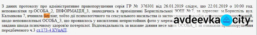 Так, в постановлении Бориспольского горрайонного суда Киевской области говорится: "... Совершила буллинг, то есть действия психологического и сексуального насилия с применением средств электронных коммуникаций, в отношении несовершеннолетнего …, в результате чего мог быть нанесен вред психическому здоровью потерпевшей”.