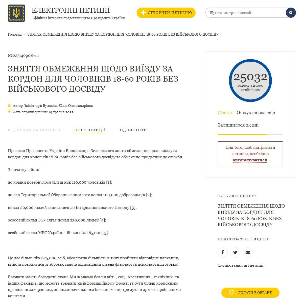 Електронна петиція із закликом до президента зняти обмеження на виїзд за кордон для чоловіків 18—60 років без військового досвіду набрала необхідні 25 тисяч голосів. Тепер її розгляне Володимир Зеленський.