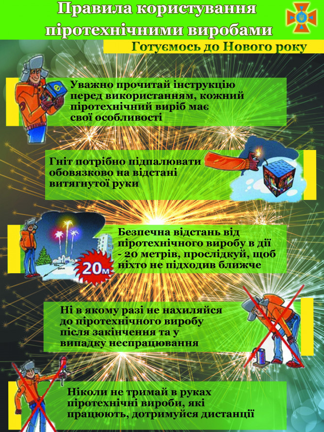забороняється запускати петарди, феєрверки, ракети з балконів чи у закритих приміщеннях. Запускати феєрверки слід на відстані не менше 100 метрів від будинків та інших об’єктів;