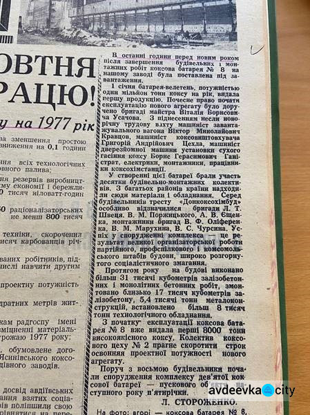 1 января 1977 года – в последние часы перед Новым годом после завершения строительных и монтажных работ коксовая батарея №8 Авдеевского коксохимического завода поставлена под загрузку. В первый день нового года батарея-гигант, мощностью 1 млн т кокса в год выдала первую продукцию.