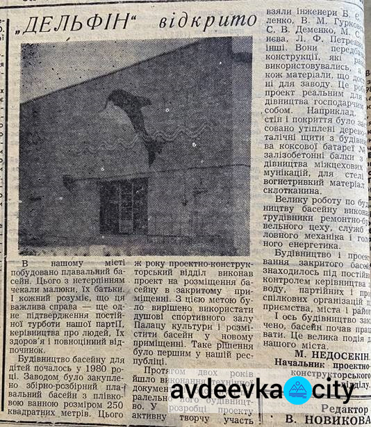 20 января 1983 года - открылся плавательный бассейн «Дельфин». Все желающие могли приобрести абонемент на месяц и посещать занятия по графику. Строительство его началось еще в 1980 году, тогда Авдеевским коксохимом был приобретен сборно-разборной плавательный бассейн с пленочной ванной размером 250 м2. В этом же году проектно-конструкторский отдел АКХЗ выполнил проект на размещение бассейна в помещении Дворца культуры.