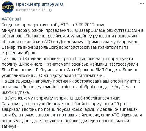 Скупая сводка пресс-центра Штаба АТО за сутки 7 сентября сообщает, что в тот день было 25 обстрелов. «В результате боевых действий один наш военнослужащий погиб», - говорится в сводке.