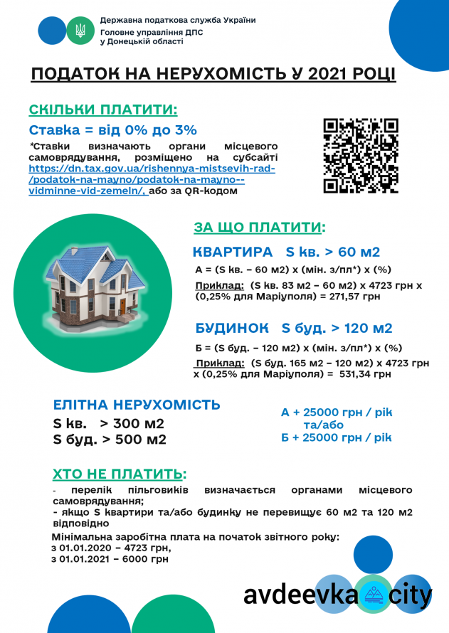 У 2021 році податок на нерухоме майно нараховується фізичним особам - власникам об'єктів нерухомості (будинків, квартир тощо) за 2020 рік, виходячи з розміру мінімальної заробітної плати, встановленої на 1 січня 2020 року - 4 723,00 гривень, повідомляє avdeevka.city.