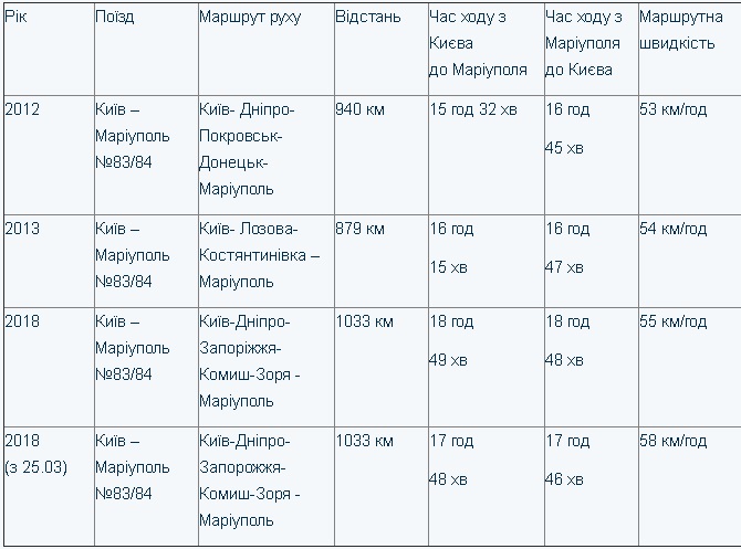По данным ДонЖД, с 25 марта поезд № 83/84 Мариуполь - Киев расстояние в 1033 км будет преодолевать за 17 часов 46 минут. До начала конфликта на Донбассе этот поезд курсировал по маршруту короче почти на 150 км, преодолевая его за 16 часов 47 минут.
