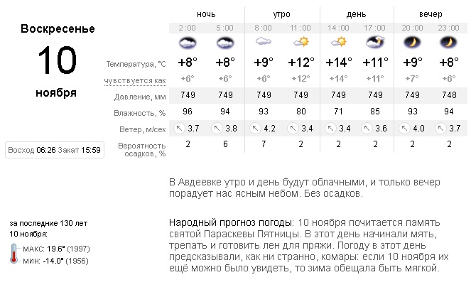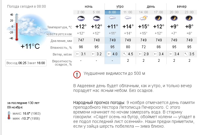 В субботу, 9 ноября, и воскресенье, 10 ноября, прифронтовую Авдеевку ждет облачная, туманная и относительно теплая для этого времени года погода. Дождей синоптики не обещают, сообщает avdeevka.city