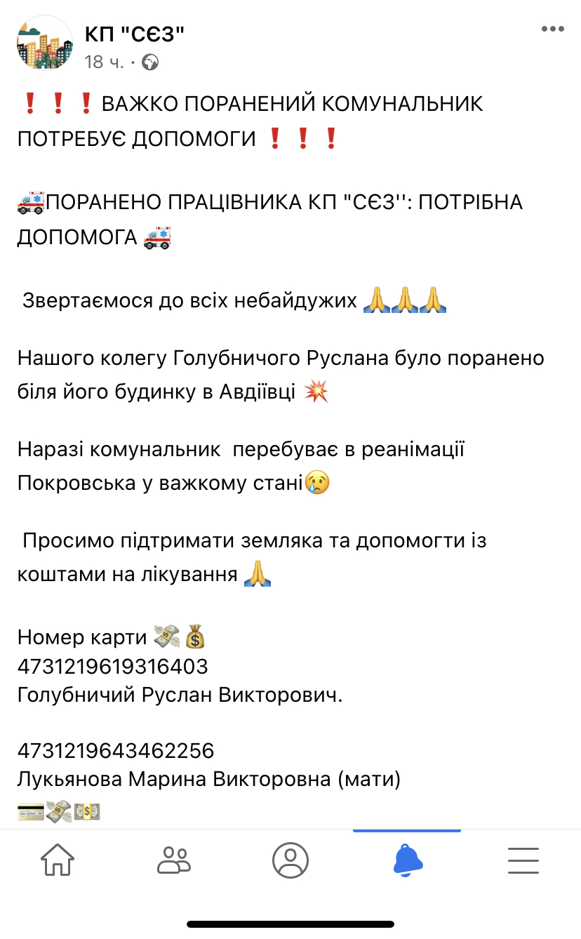Колектив КП "Служба єдиного замовника" звертається до всіх небайдужих мешканців Авдіївки з проханням допомогти врятувати колегу Голубничого Руслана, який отримав поранення біля свого будинку в результаті обстрілів міста.