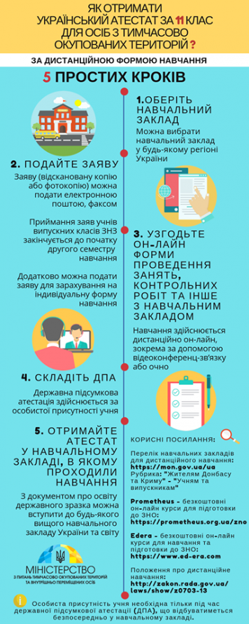 В свою очередь, Министерство по вопросам временно оккупированных территорий и ВПЛ Украины опубликовало инфографику: 5 простых шагов для получения украинского аттестата для жителей со временно оккупированной территории. В ней указаны полезные ссылки для получения исчерпывающей информации для учеников и их родителей