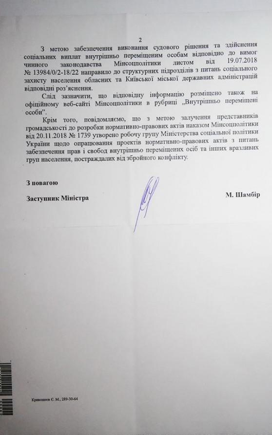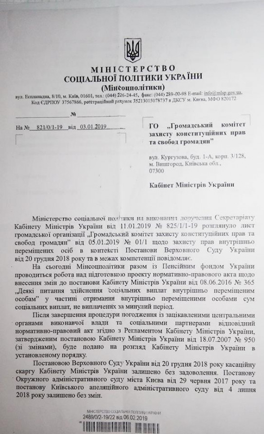 Министерство социальной политики Украины дало разъяснение Общественной организации «Громадський комітет захисту конституційних прав та свобод громадян» («Общественный комитет защиты конституционных прав и свобод граждан») по поводу проверок внутренне перемещенных лиц (ВПЛ).