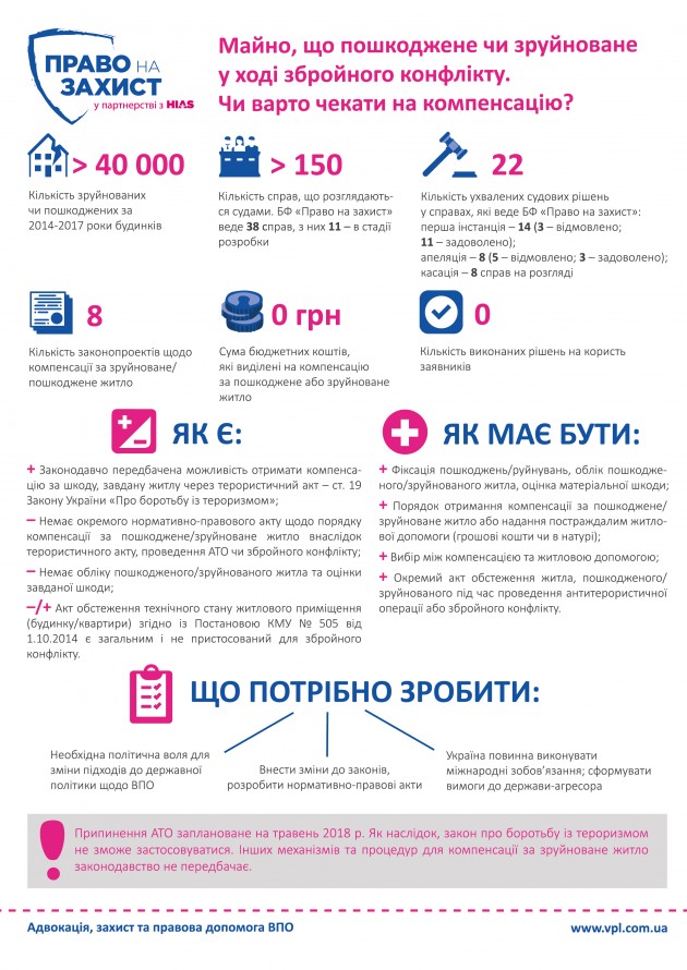 Правозащитница указала на то, что после официального прекращения АТО, которое запланировано на 30 апреля, образуется правовой вакуум относительно реализации права пострадавших на компенсацию за поврежденное или разрушенное жилье. Это является следствием принятого закона №2268 (Об особенностях государственной политики по обеспечению государственного суверенитета Украины на временно оккупированных территориях в Донецкой и Луганской областях), поскольку закон о борьбе с терроризмом будет применяться к фактам повреждений или разрушений, которые произойдут после этой даты, а закон о реинтеграции не предусматривает механизма компенсации в связи с мерами по обеспечению национальной безопасности.