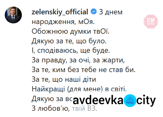 Президент України Володимир Зеленський сьогодні привітав дружину Олену з днем народження. Віршоване привітання глава держави розмістив в Instagram, повідомляє avdeevka.city.