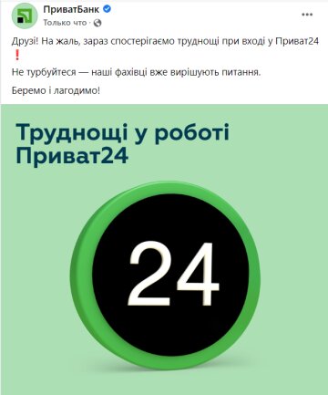 "Друзі! На жаль, зараз спостерігаємо труднощі при вході у Приват24! Не турбуйтеся - наші фахівці вже вирішують питання. Беремо і лагодимо!" - ідеться в заяві.
