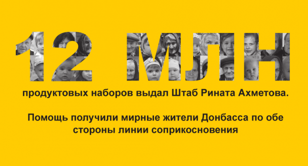 По состоянию на 9 февраля Гуманитарный штаб Рината Ахметова выдал 12 миллионов продуктовых наборов мирным жителям Донецкой и Луганской областей по обе стороны линии соприкосновения.