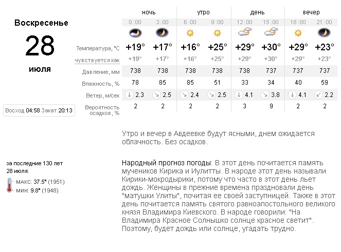 В воскресенье, 28 июля, утро и вечер в Авдеевке будут ясными, днем ожидается облачность. Без осадков.Температура: от + 16 ранним утром - до + 30 днем.