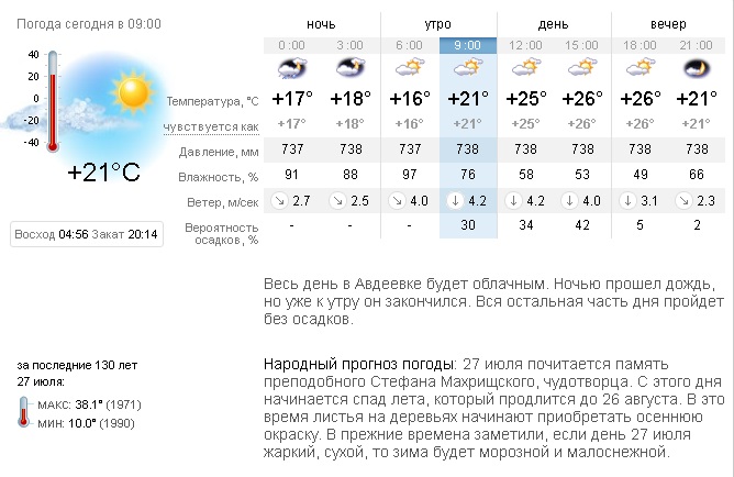Весь день в Авдеевке будет облачным. Ночью прошел дождь, но уже к утру он закончился. Вся остальная часть дня пройдет без осадков, пишет о субботе, 27 июля, в нашем городе сайт sinoptik.ua. Минимальная температура сегодня была ранним утром (+16), максимальную обещают днем (+26).