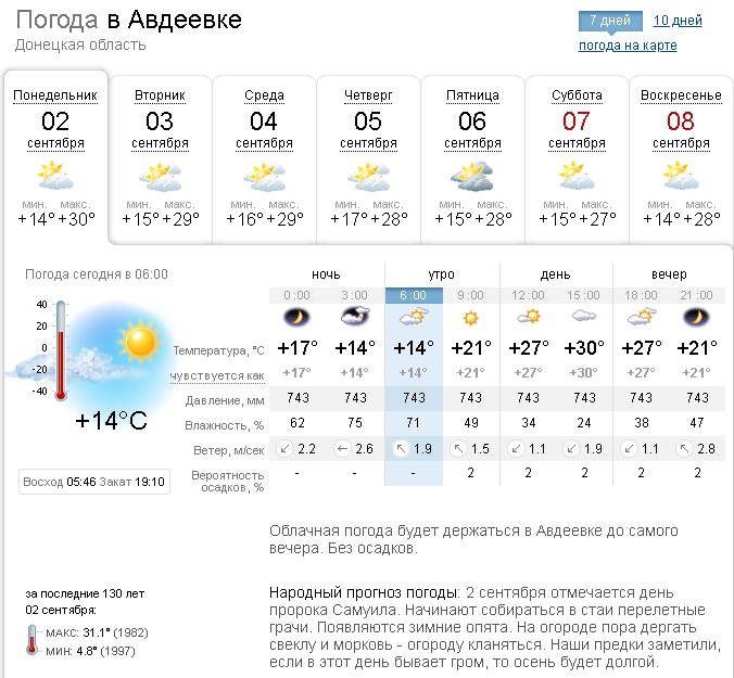 Максимально столбик термометра в Авдеевке поднимется днем 3 и 4 сентября (до + 29), сообщает sinoptik.ua