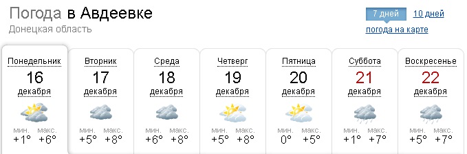 Вся неделя в Авдеевке будет облачной. Прояснения возможны лишь 19 и 20 декабря. А 21 и 22 декабря (суббота и воскресенье) синоптики обещают осадки в виде дождя.