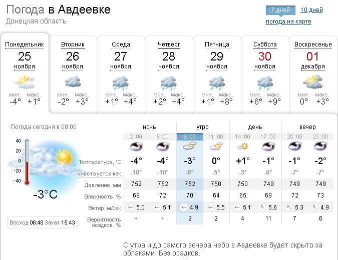 В течение недели, с 25 ноября по 1 декабря, прифронтовую Авдеевку ожидает, пасмурная погода. Станет теплее, при этом большую часть недели будет дождить, сообщает avdeevka.city.