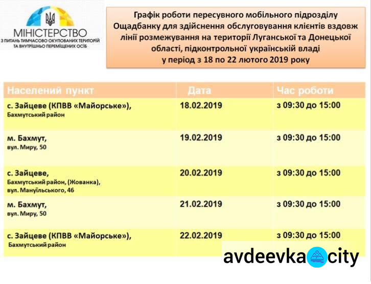 Мобильное подразделение "Ощадбанка" будет обслуживать клиентов вблизи линии разграничения в Бахмуте и Зайцево в период с 18 по 22 февраля. Об этом сообщает пресс-служба Министерства по вопросам временно оккупированных территорий и внутренне перемещенных лиц.