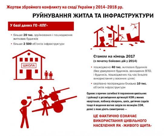 «В нашей базе есть информация о более чем 20 тыс. таких жилых домов и более чем 2,5 тыс. объектов инфраструктуры. Но по состоянию на конец 2017 года в целом повреждено около 40 тыс. жилых домов. И серьезно пострадали около 10 тыс., - отметил правозащитник. - У нас есть данные двух видов. Одни данные мы внесли в базу – то, что нашли и зафиксировали. Вторые – это то, что мы получили в ответах на информационные запросы. И там из них выплывает, что еще больше повреждений».