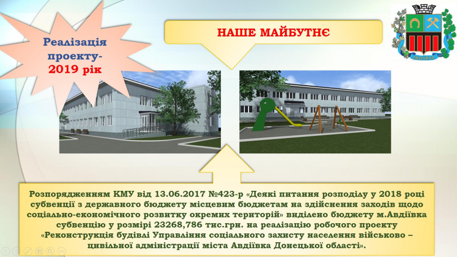 В УСЗН отметили, что проект реализуется в рамках распоряжения Кабмина от 13 июня 2017 года. На его реализацию бюджет Авдеевки получил субвенцию в размере 23268,786 тыс. грн.