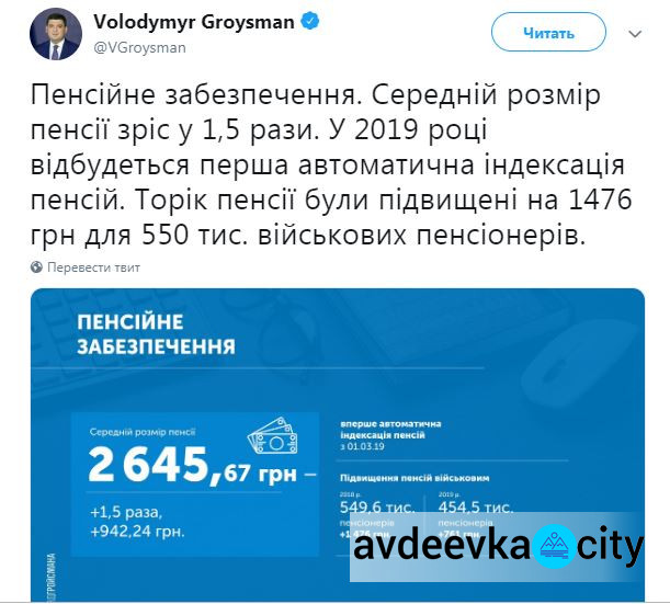 По словам главы Кабмина, за минувший год средний размер пенсии вырос в 1,5 раза. Гройсман также объявил, что с 1 марта начнется первая автоматическая индексация пенсий.