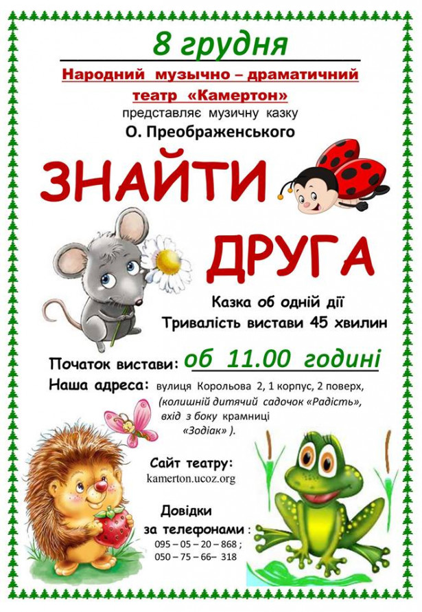 Представление начнется в 11:00 по адресу ул. Королева, 2, 1 корпус, 2 этаж (бывший детсад «Радость», вход со стороны магазина «Зодиак»). Приглашаются дети и родители. Справки по телефонам: 095-05-20-868, 066 44 26 050, 066-929-99-28.
