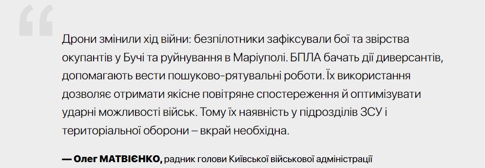 Безпілотники дозволяють стежити за силами противників, перенацілювати зброю, вживати заходів, щоб зупинити просування ворога чи врятувати життя. Завдяки дронам кожна частина, що має цих «пташок», отримує суттєву тактичну перевагу. На жаль, БПЛА – це витратний матеріал: зазвичай дрон здатен пережити 10-15 вильотів. Тож захисники потребують їх постійного поповнення.