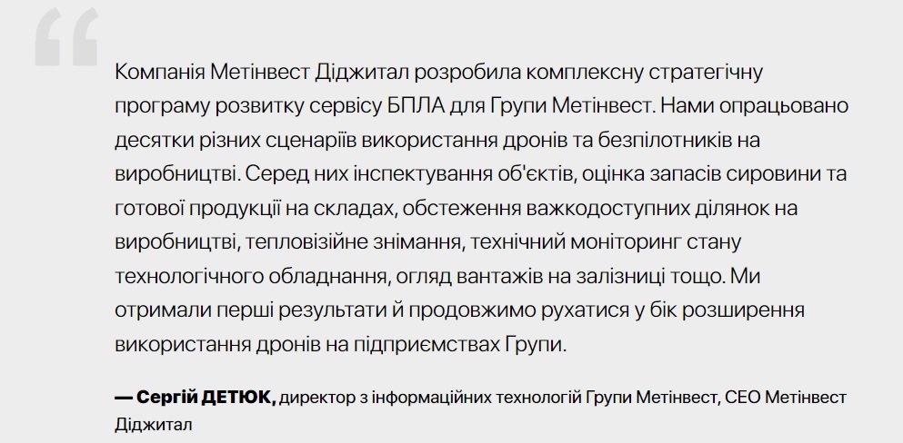 Метінвест використовує дрони з 2018 року. Спочатку вони застосовувалися переважно для охорони території та об’єктів промислової інфраструктури. Зараз в компанії Метінвест Діджитал створено окремий ІТ-сервіс, який відповідає за впровадження та застосування БПЛА на підприємствах Групи.