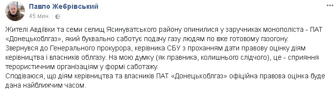 «Обратился к Генеральному прокурору, руководителю СБУ с просьбой дать правовую оценку действиям руководства и владельцев облгаза. По моему мнению (как юриста, бывшего следователя), это - содействие террористическим организациям в форме саботажа, - пишет губернатор на своей странице в Фейсбуке. - Надеюсь, что действиям руководства и владельцев «Донецкоблгаза» официальная правовая оценка будет дана в ближайшее время».