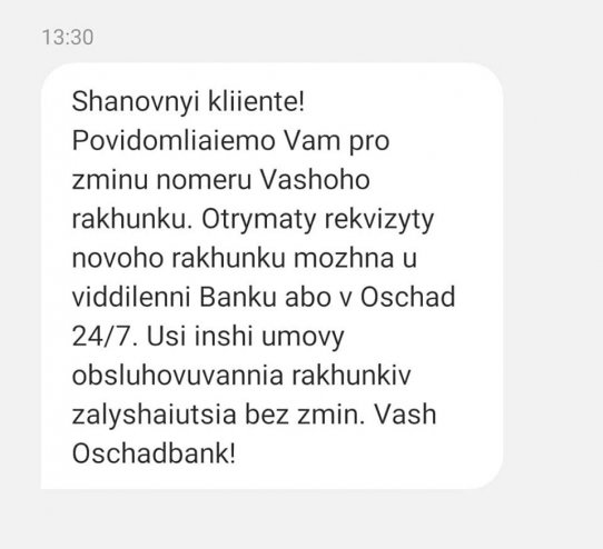 АО «Ощадбанк» разместил на своем сайте информацию о сообщении Национального банка Украины: с 5 августа 2019 года в Украине вводится международный номер банковского счета (IBAN), который состоит из 29 буквенно-цифровых символов. Клиенты были предупреждены, что с 5 августа 2019 года они будут получать от банка информацию об изменении действующего счета по стандарту IBAN, сообщает dnews.dn.ua