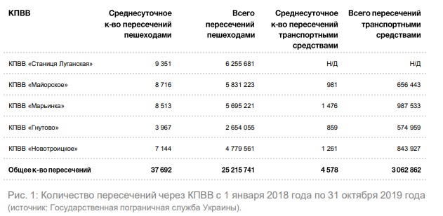 Несмотря на крайне непростые условия прохождения КПВВ и блокпостов, согласно данным Государственной пограничной службы Украины (ГПСУ), количество пересечений увеличивается с каждым годом: от 8,5 млн в 2016 году до 13,5 млн в 2018 году. В 2019 году эта тенденция сохраняется.
