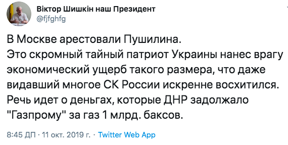 Сообщения об аресте Пушилина практически одновременно появились в Twitter первого Генпрокурора Украины Виктора Шишкина и на донецком ресурсе «Бывало и лучше».