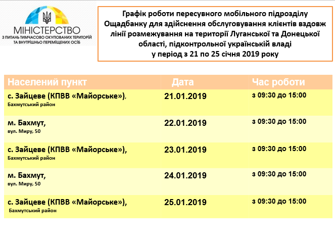 Пресс-служба Министерства по вопросам временно оккупированных территорий и внутренне перемещенных лиц сообщает, что МП «Ощадбанка» будет работать в н.п. Зайцево (КПВВ «Майорское», Бахмутский р-н) и г. Бахмуте.